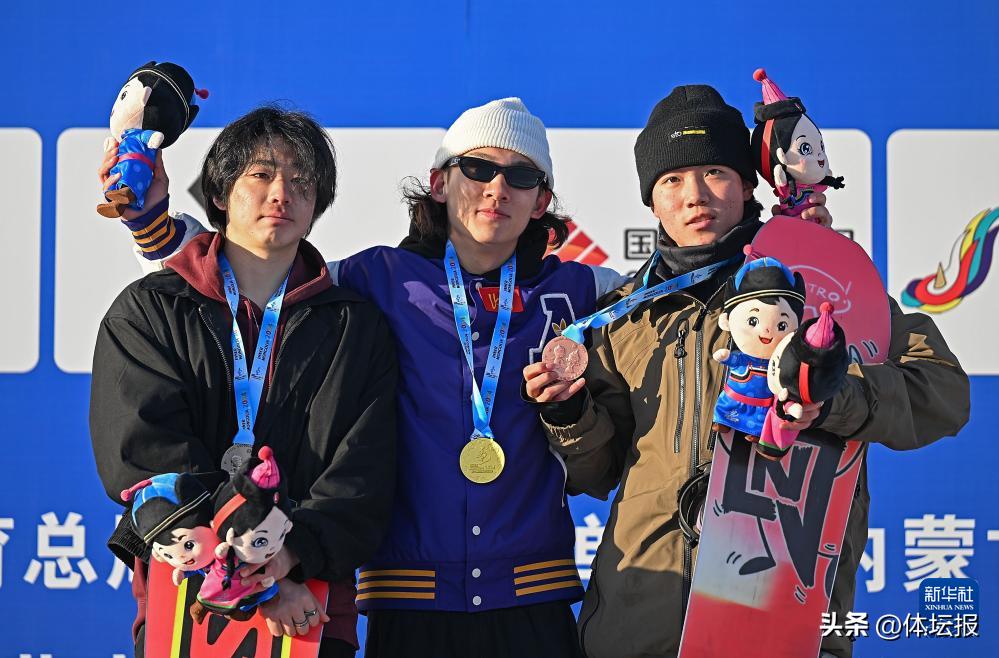 2月24日,冠軍山西隊選手蘇翊鳴(中)、亞軍黑龍江隊選手高雪松(左)和季軍山東隊選手劉昊宇在頒獎儀式上。新華社記者 貝赫 攝