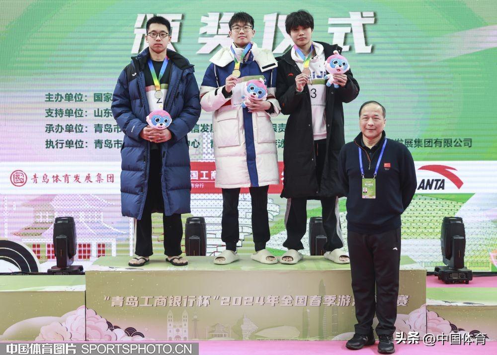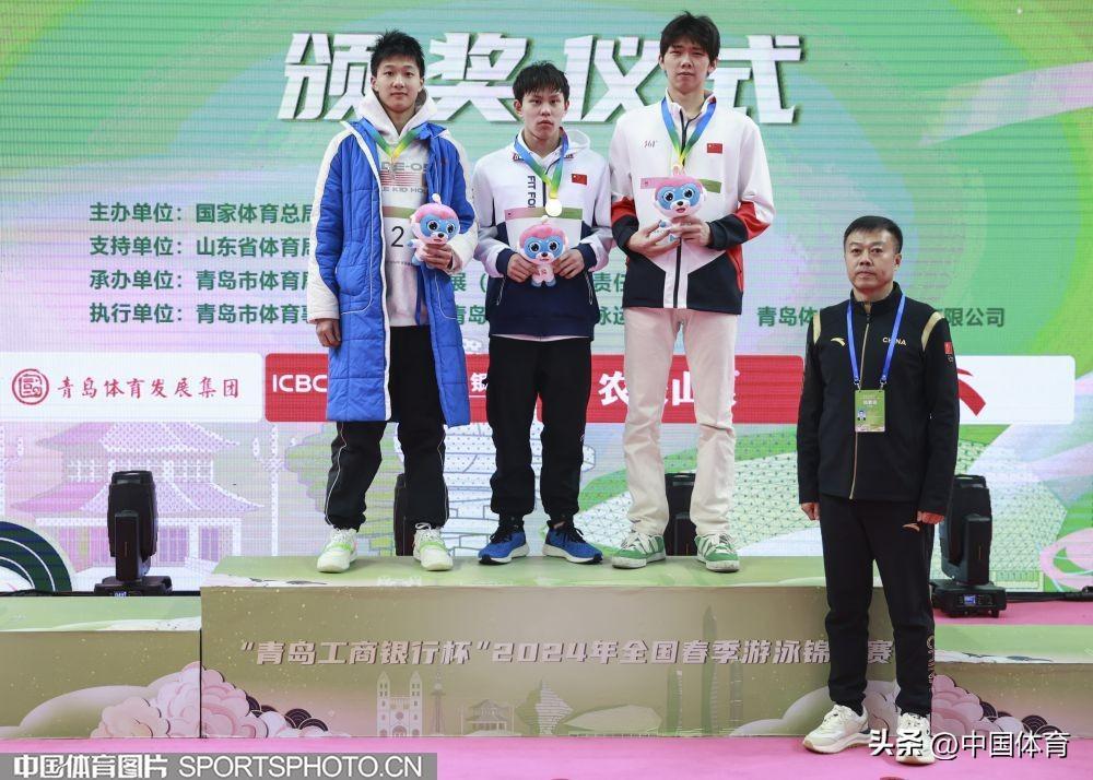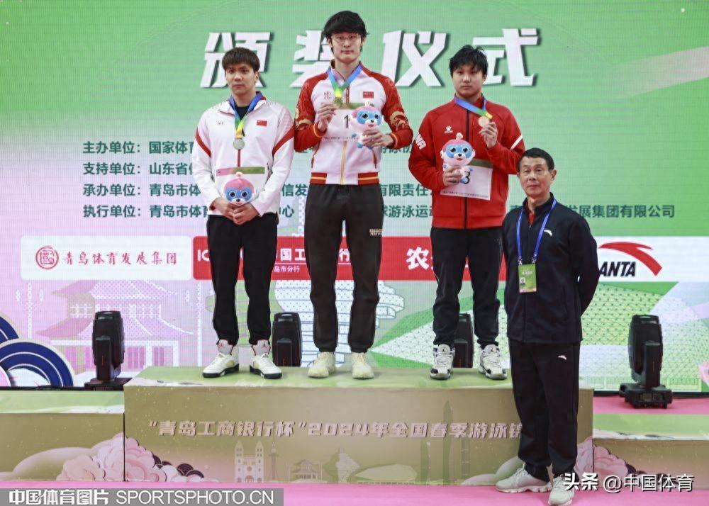 冠軍趙一樸(中)、亞軍陸嘉豪(左)、季軍李子龍在男子400米自由泳頒獎儀式上