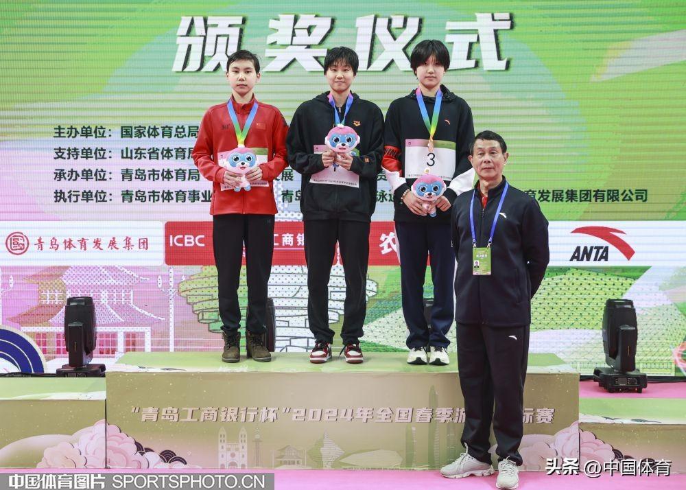 冠軍成涵瑀(中)、亞軍吳若欣(左)、季軍龔真琦在女子1500米自由泳頒獎儀式上