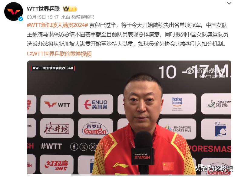 國乒女隊主教練馬琳表示,如果中國女乒主力在本週的WTT新加坡大滿貫、本月下旬的WTT仁川冠軍賽、4月的澳門女子世界盃、5月的WTT沙特大滿貫輸給外協會對手,該球員將被扣分。