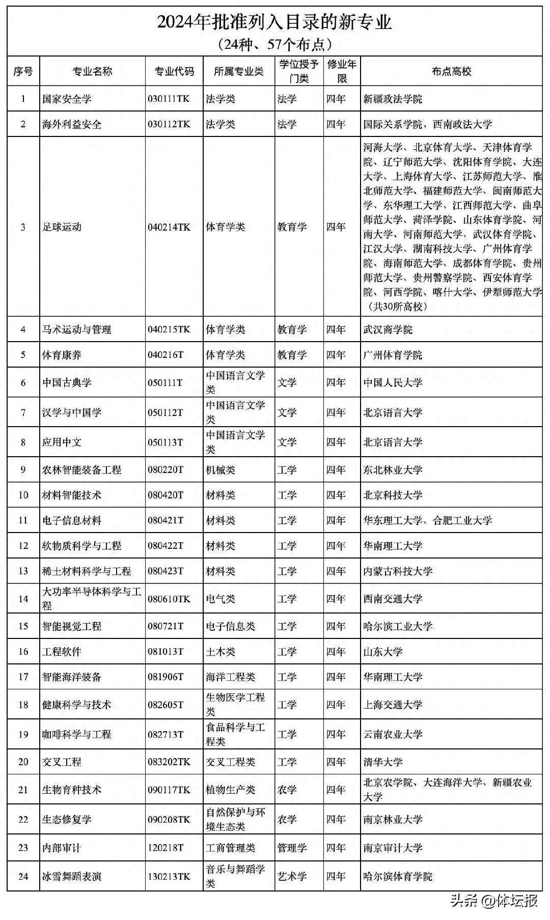 3月19日,教育部公佈了2024年普通高等學校本科專業目錄,其中新增24種本科專業,包括國家安全學、海外利益安全、足球運動等。