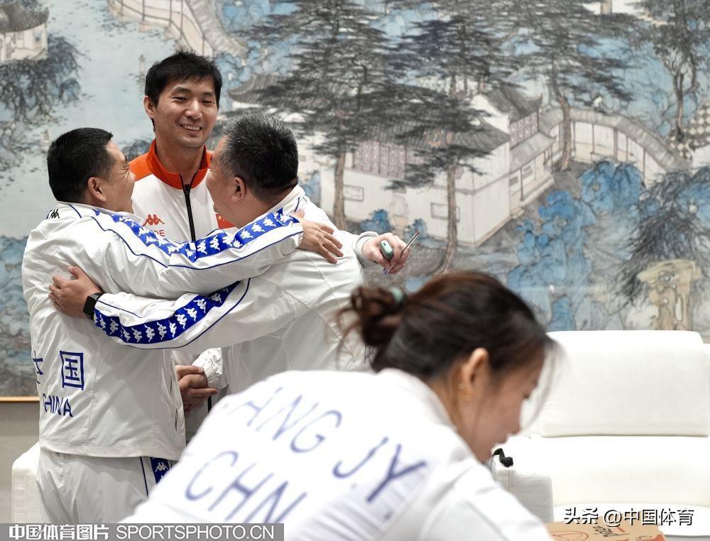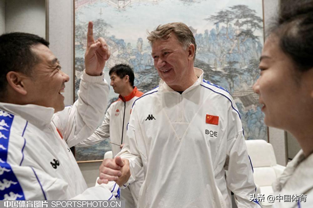 中國隊主教練亞歷山大·格拉祖諾夫 (中)與教練組成員握手慶祝