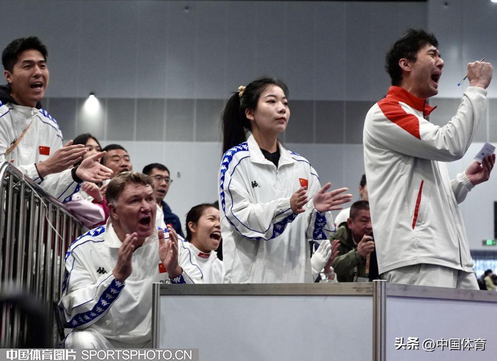 中國隊主教練亞歷山大·格拉祖諾夫(前排左一)爲隊員加油