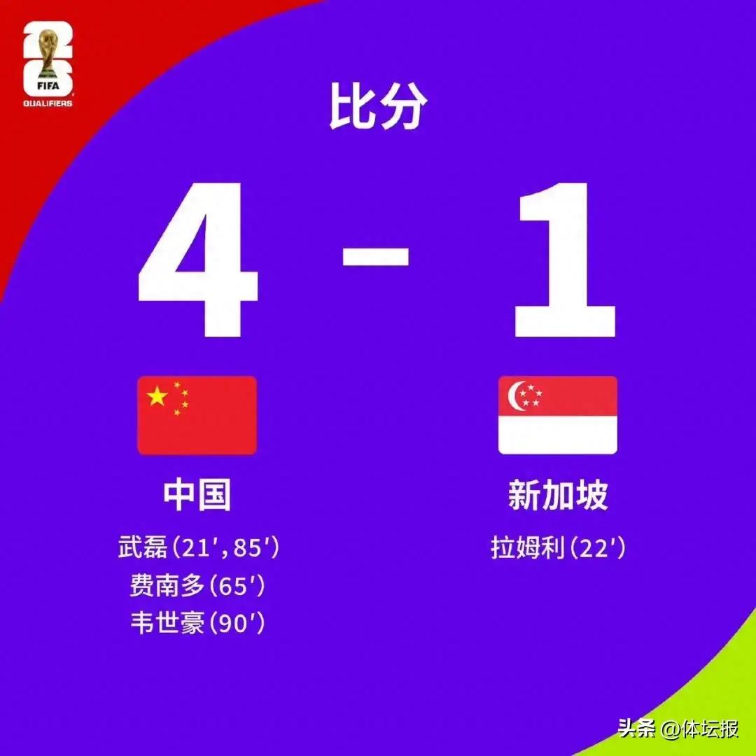 今晚,中國男足迎來了本屆世預賽36強賽與新加坡隊的第二次交手。最終,主場作戰的國足憑藉武磊的梅開二度和費南多、韋世豪的進球4:1大勝新加坡,四輪過後積7分暫居小組第二。