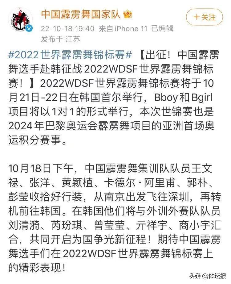 10月18日下午,中國霹靂舞集訓隊部分隊員從南京啓程前往韓國首爾,參加10月21日-22日進行的2022WDSF世界霹靂舞錦標賽。據瞭解,本次世錦賽Bboy和Bgirl項目將以1對1的形式舉行,這也是2024年巴黎奧運會霹靂舞項目的亞洲首場奧運積分賽事。