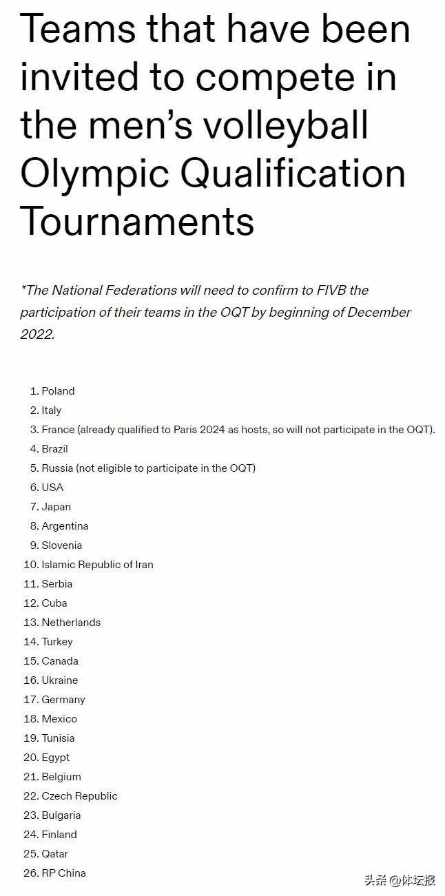 國際奧委會官網在報道中介紹稱:“目前男排世界排名1-26位的球隊中除法國和俄羅斯外,其餘24支球隊將於2023年9月30日至10月8日參加奧運資格賽,爭取巴黎奧運會的入場券。屆時,將會有6支球隊直接鎖定奧運會參賽席位。”