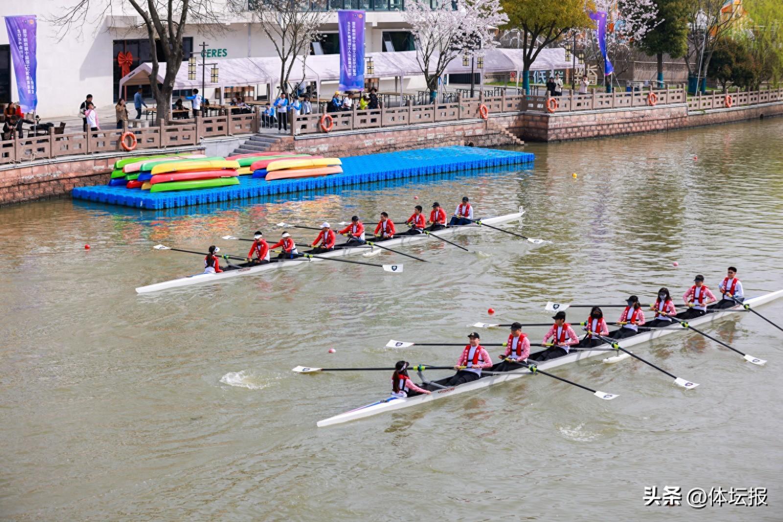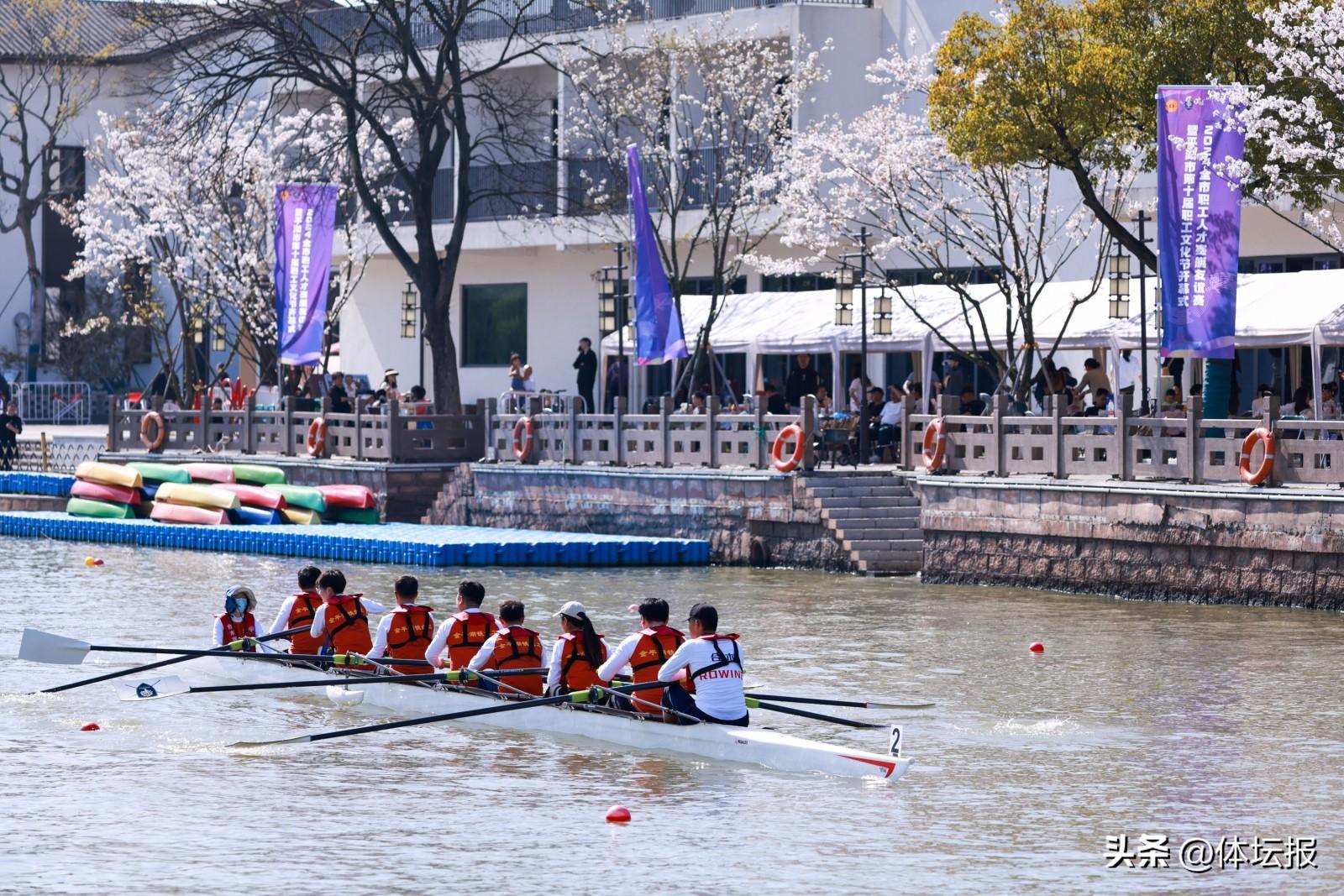 “嘀——”伴隨着響亮的鳴笛聲,500米競速賽正式開戰。航道水面上,賽艇猶如離弦之箭,劈開澄澈河面,艇上選手們節奏一致,前後奮力揮舞着賽艇槳濺起陣陣水花。