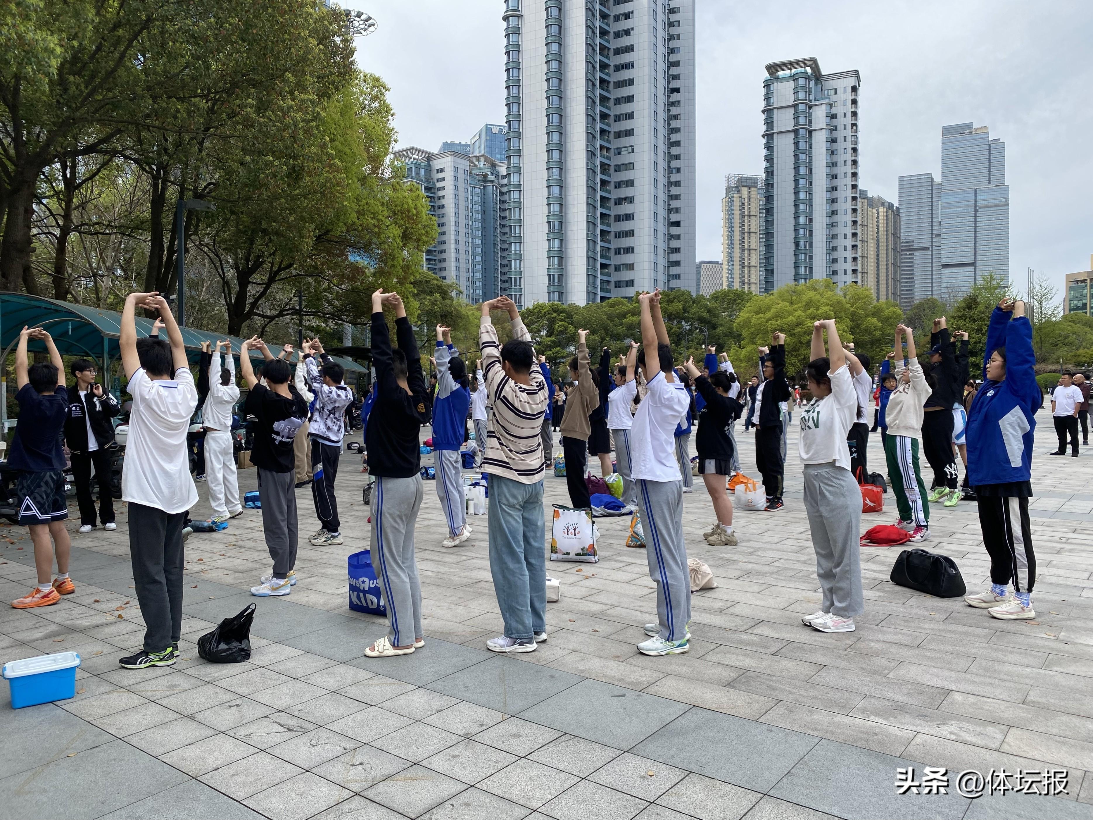 現場,杭州市筧橋實驗中學的考生們正在體育老師的帶領下進行壓腿、拉伸等熱身運動。一旁圍着不少家長,注視孩子的一舉一動,或用手機記錄下考前的珍貴瞬間。