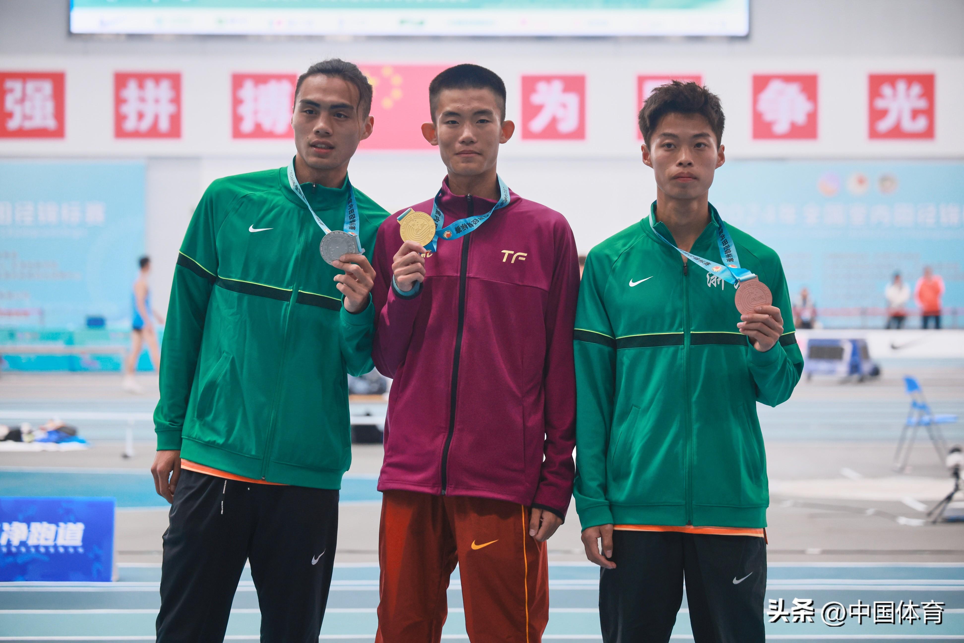 男子三級跳遠冠軍粟文(中)、亞軍吳瑞庭(左)、季軍羅家駿在頒獎儀式上