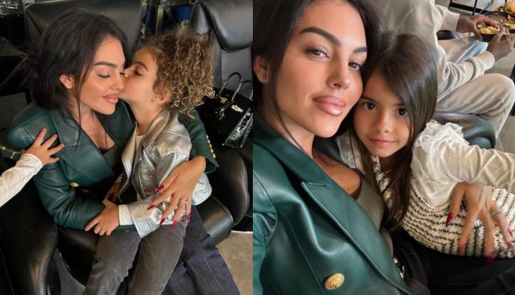 喬治娜也第一時間分享了觀戰畫面,只見她穿了一件牛油果綠的皮衣外套,搭配休閒牛仔褲,大氣優雅,喬治娜還與繼子迷你羅近距離自拍,關係非常和睦。