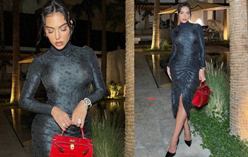 近日,C羅的未婚妻喬治娜更新了個人INS狀態,分享了一段參加某美妝品牌的宣傳活動視頻,只見,喬治娜穿了一件深藍色的緊身長裙,好身材被包裹得嚴嚴實實,手提紅色名牌包,非常豔麗,裙襬的高衩設計,讓喬治娜的美腿“小心翼翼”地露出,更增加了女人味。