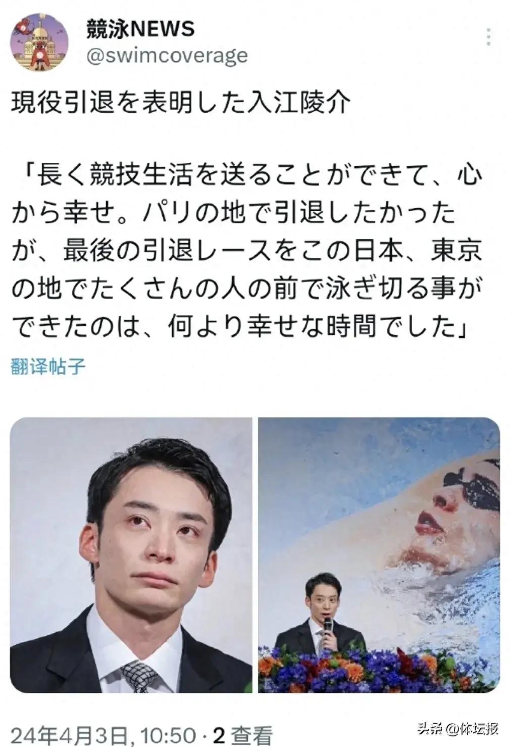 新華社東京4月3日消息,日本仰泳名將入江陵介3日在東京召開發佈會,宣佈結束長達18年的職業生涯。