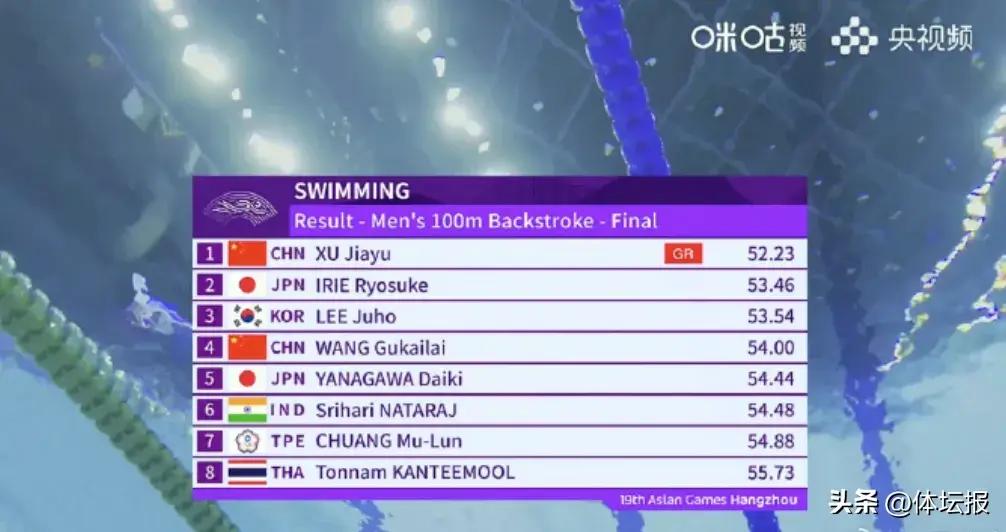 去年,杭州亞運會男子100米仰泳決賽,中國選手徐嘉餘游出52秒23,破賽會紀錄奪金,日本選手入江陵介與韓國選手李周浩分獲二三名。