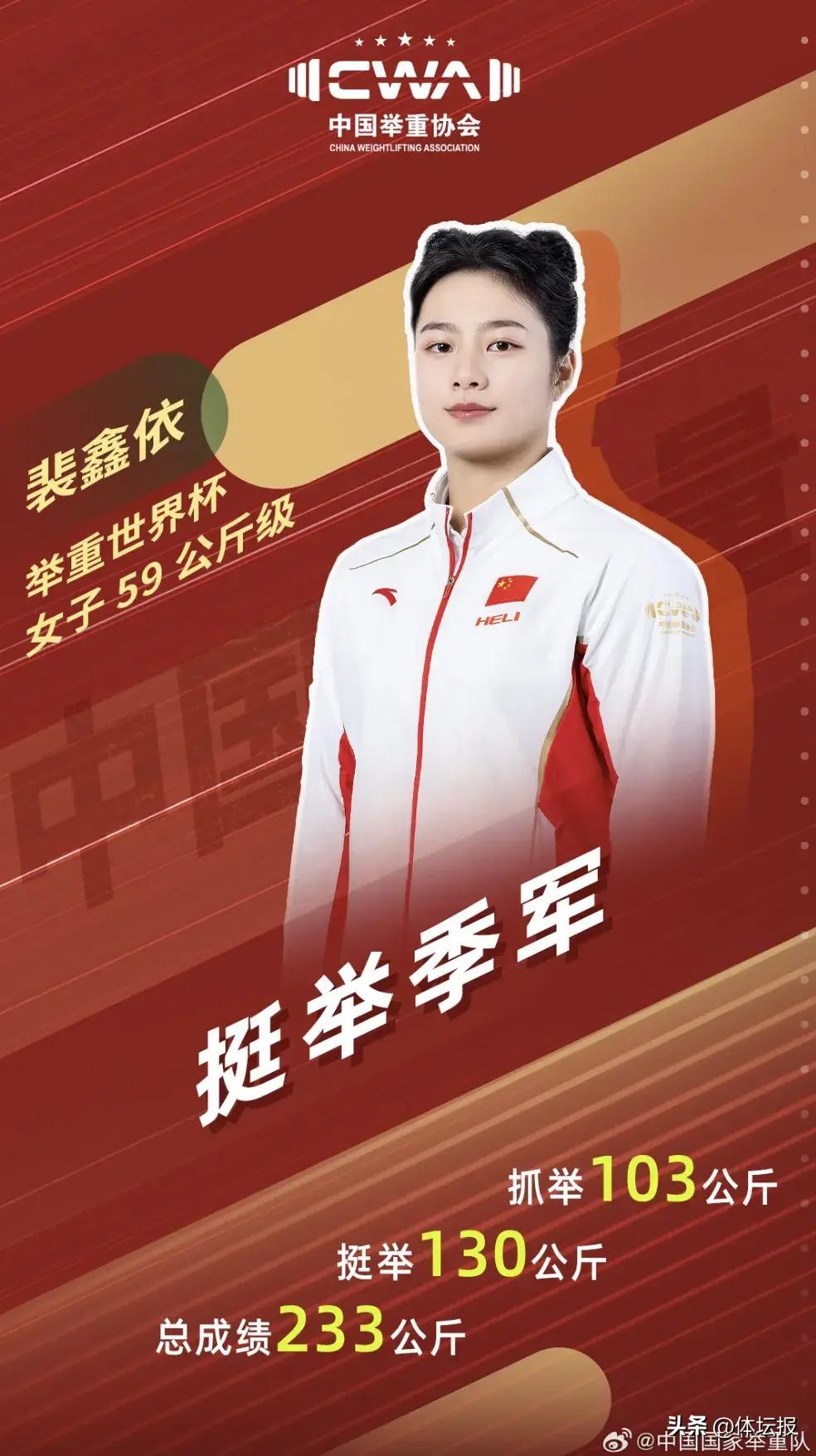 另一名中國女子舉重運動員、浙江籍選手裴鑫依以抓舉103公斤、挺舉130公斤、總成績233公斤獲得挺舉銅牌和總成績的第四名。