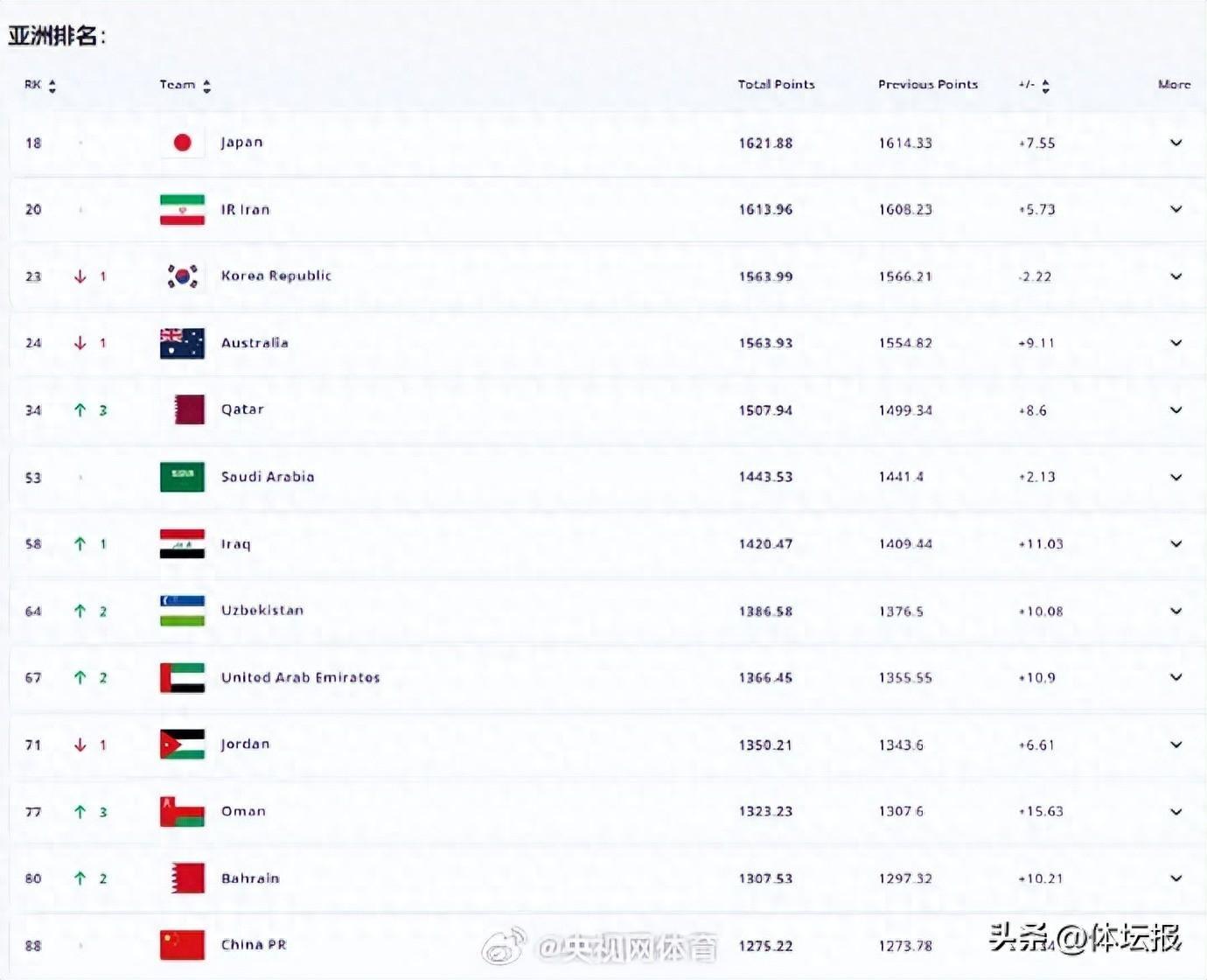北京時間4月4日下午,國際足聯官方公佈最新一期各會員協會代表隊世界排名,中國隊排名不變,位列世界第88位、亞洲第13位。由於排名積分分別落後巴林隊(亞洲第12位)、阿曼隊(第11位)多達32分、48分,國足短期內已經很難重返亞洲前10行列。