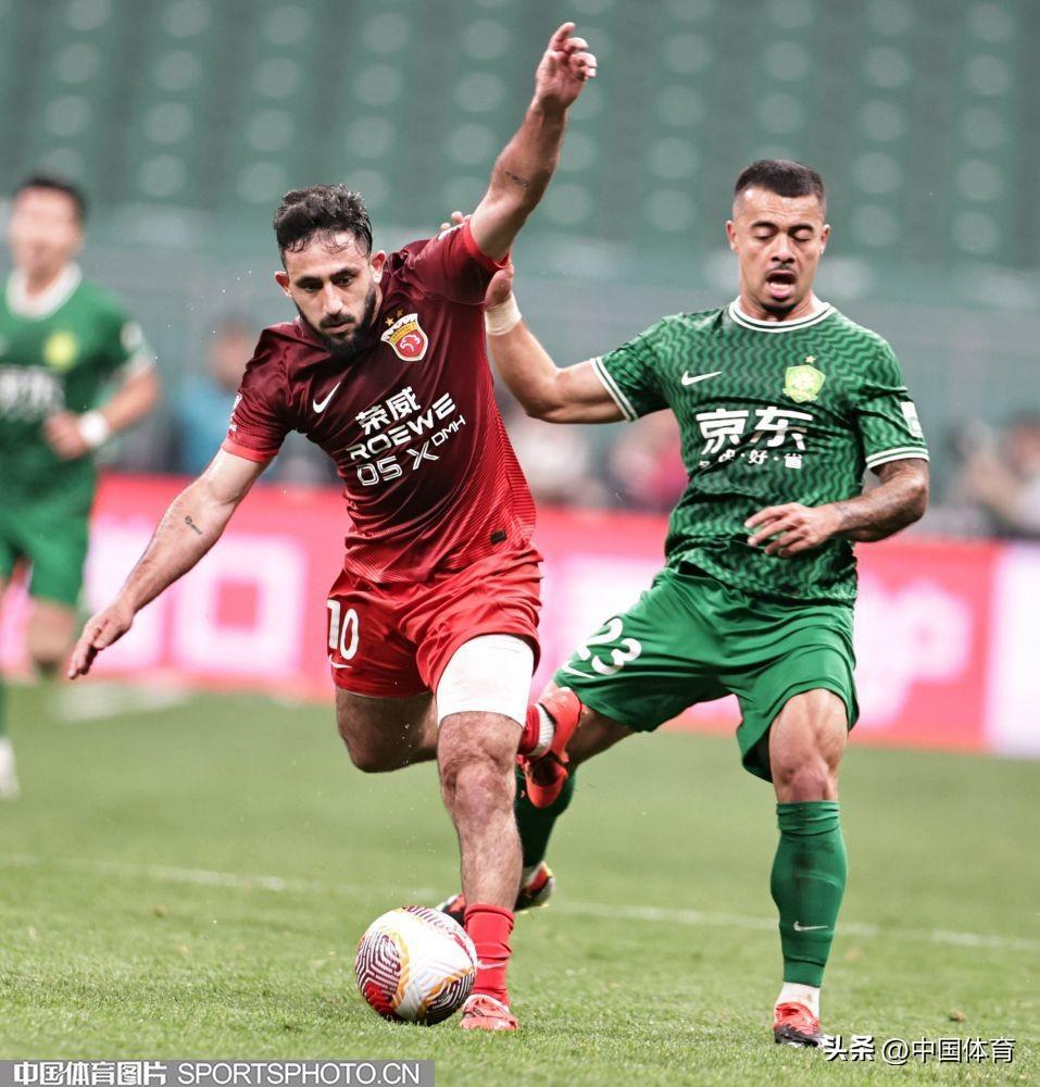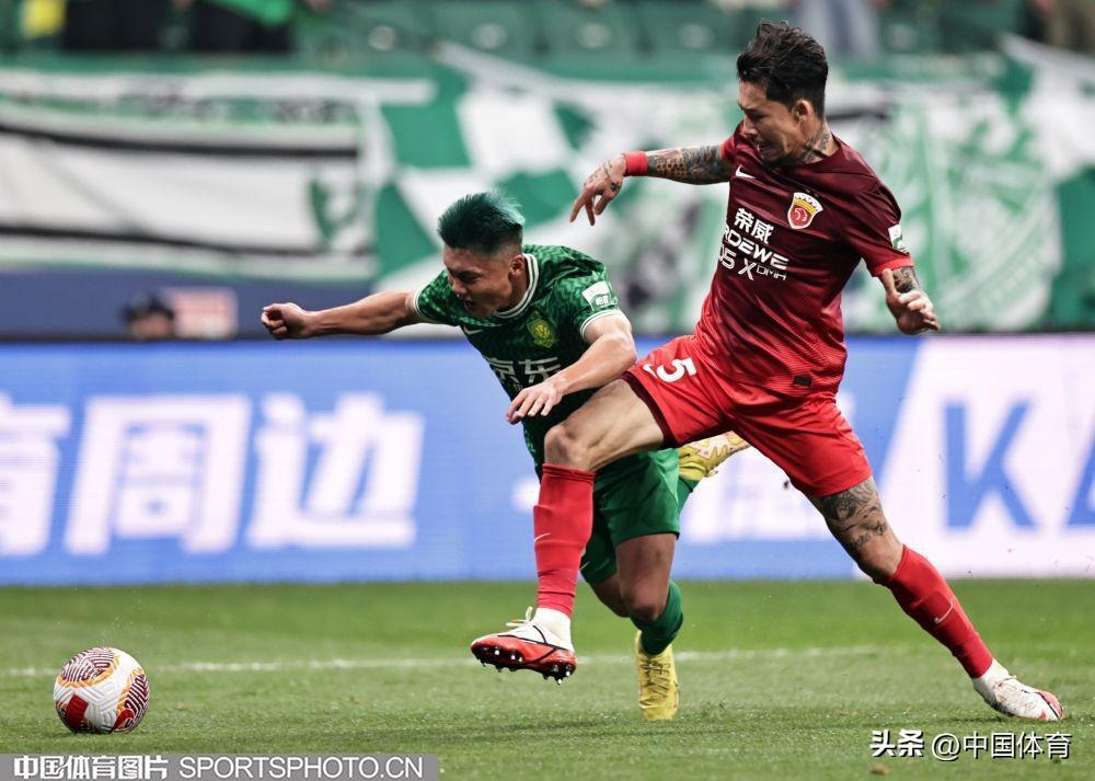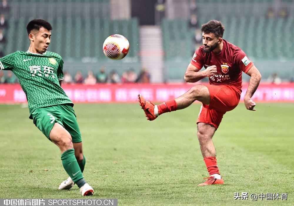 北京國安隊何宇鵬防守上海海港隊巴爾加斯