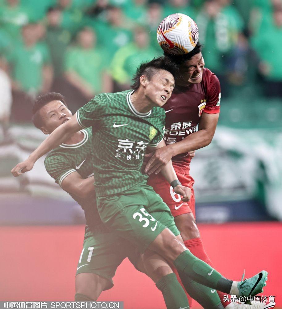 北京國安隊江文豪與上海海港隊蔡慧康爭頂頭球