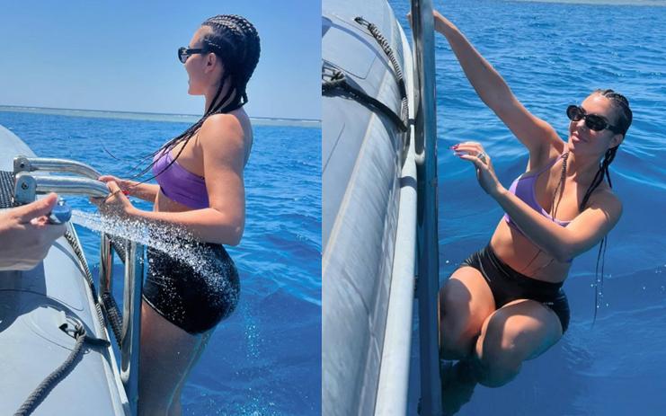 這次出遊,喬治娜自掏腰包,租了一輛豪華遊艇,孩子們上船之後都非常興奮,喬治娜也體驗了一把“下海”的感覺,從甲板上慢慢潛入碧藍的汪洋,一頭溼發垂肩,顯得更加有女人味。