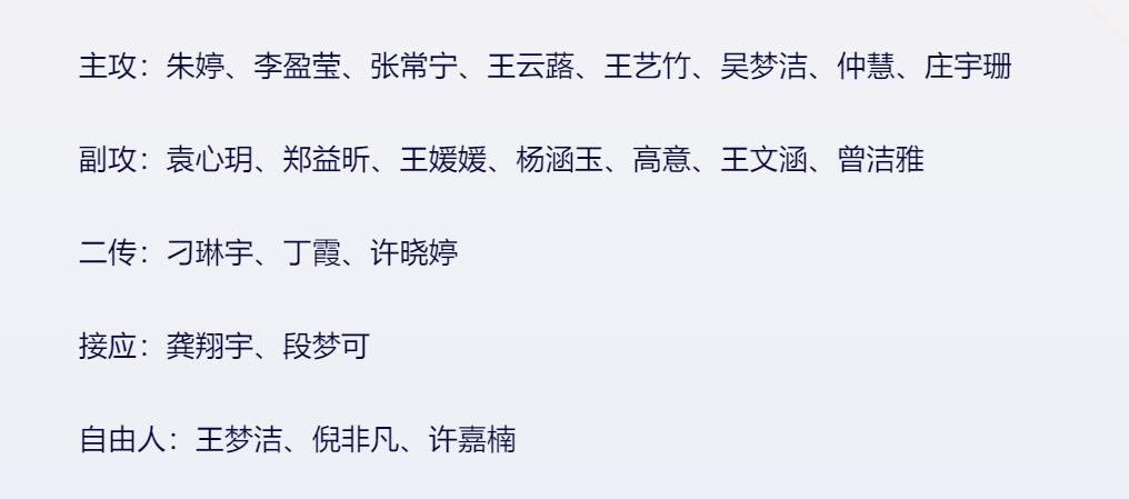 除了主攻線外,副攻、二傳、接應和自由人位置上也有衆多實力派球員。副攻位置上,袁心玥、鄭益昕、王媛媛等人都是國內頂尖的副攻手。二傳位置上,刁琳宇、丁霞和許曉婷都是經驗豐富的老將,她們的調度和組織能力將是中國女排進攻流暢的關鍵。接應龔翔宇和段夢可都是年輕有爲的球員。自由人位置上,王夢潔、倪非凡和許嘉楠都是防守出色的球員,值得期待。