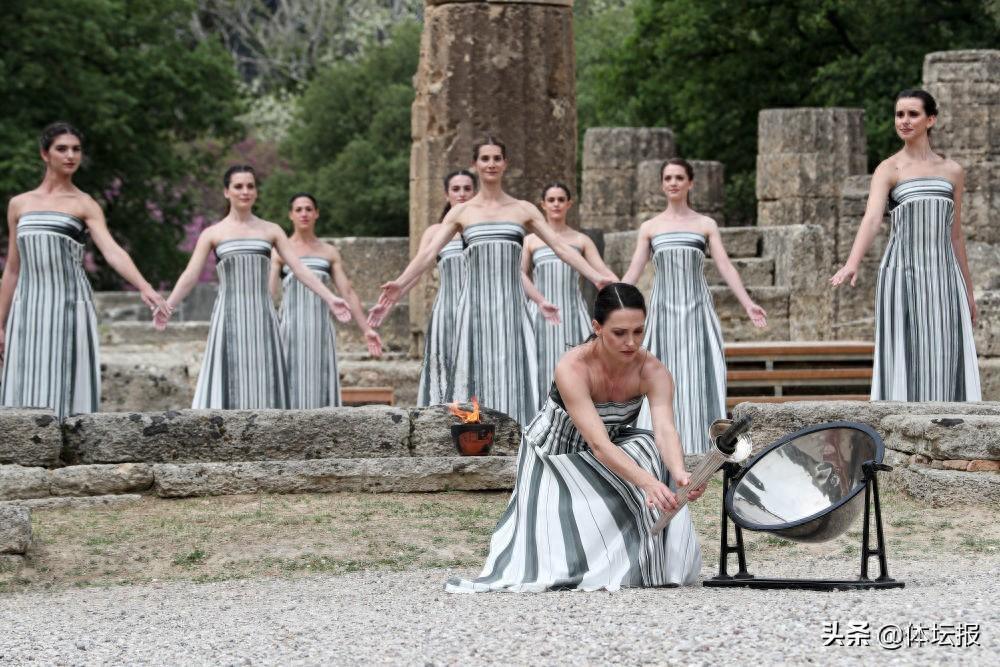在有2500多年曆史的赫拉神廟前,希臘女演員瑪麗·米娜扮演的古希臘女祭司在當地時間中午12時16分點燃了火種。她在火種採集儀式上按照傳統祈福世界和平,希望法國巴黎成功舉辦奧運會。