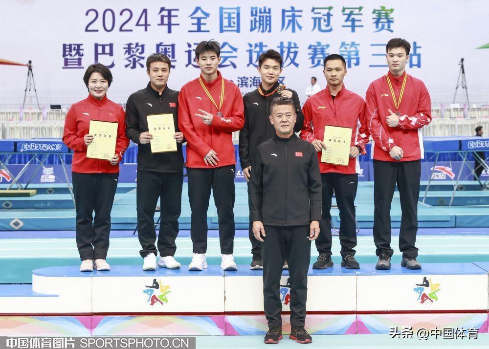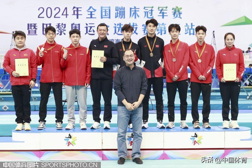 男子雙蹦牀個人冠軍趙嘉輝(右三)、亞軍何彬(左三)、季軍羅仁彬(右一)在頒獎儀式上