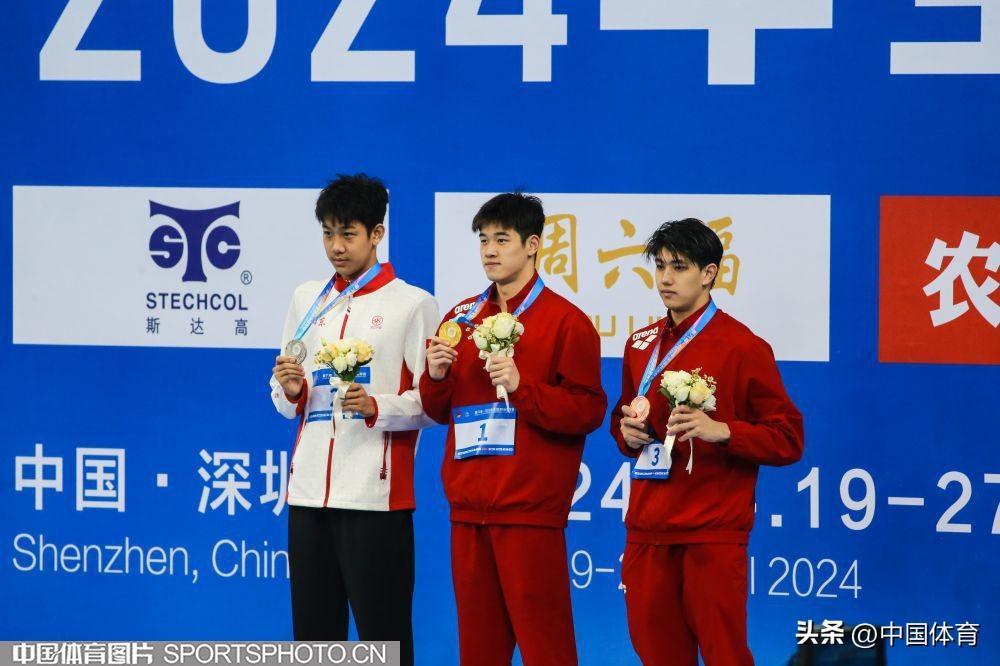 冠軍潘展樂(中)、亞軍張展碩(左)和季軍費立緯在男子400米自由泳頒獎儀式上