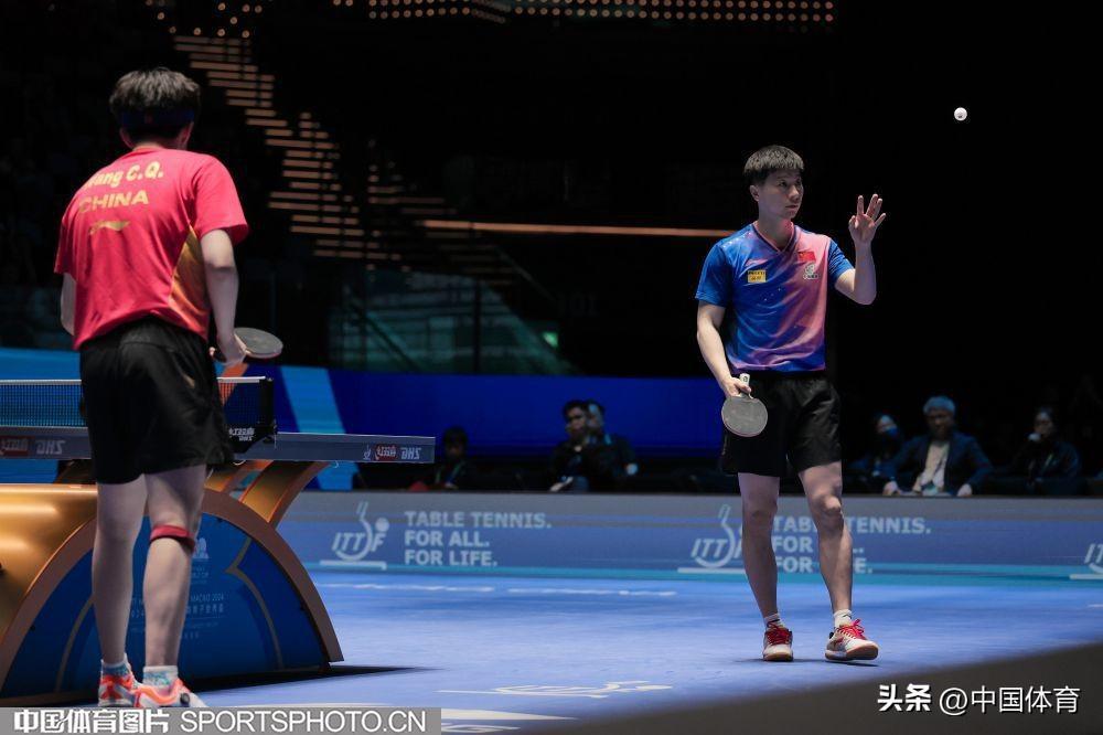 中國體育訊 4月20日,2024年國際乒聯世界盃繼續在澳門銀河綜藝館舉行。在男子單打半決賽中,中國隊選手(藍衣)馬龍以4比0戰勝隊友王楚欽,晉級決賽。圖爲馬龍與王楚欽在比賽中。(中國體育圖片 鹿麟 攝)