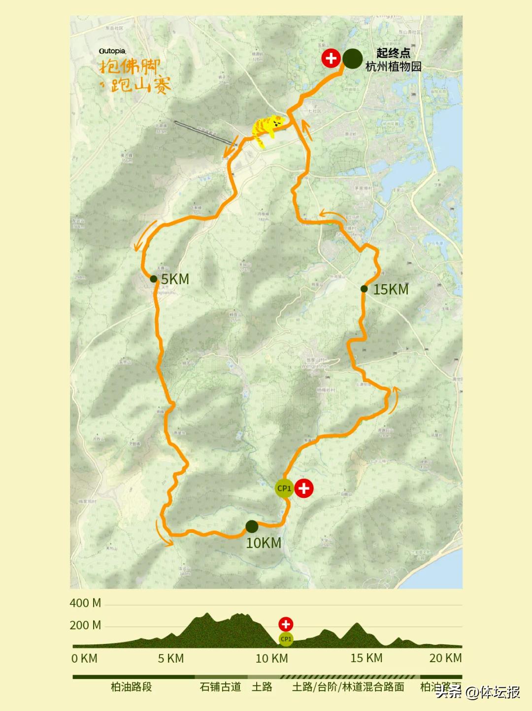 今年是抱佛腳跑山賽的首屆,因爲途經韓美林藝術館裏6米高的巨型佛頭、靈隱寺、法喜寺等景點而命名。賽道上的十里琅璫、九溪、上滿覺隴、南高峯、中國茶葉博物館西湖經典景色也同樣吸引着選手。賽事全程20公里,爬升800米。相對成熟且難度適中的賽道,寬鬆的關門時間和豐盛的賽事補給,讓越野跑新人也可以安全快樂地完成人生首野。