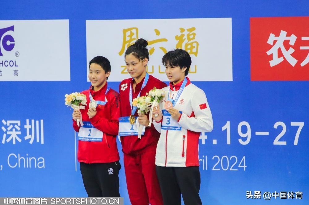 (左起)女子400米個人混合泳亞軍於子迪、冠軍餘依婷、季軍曲佳凝在頒獎儀式上