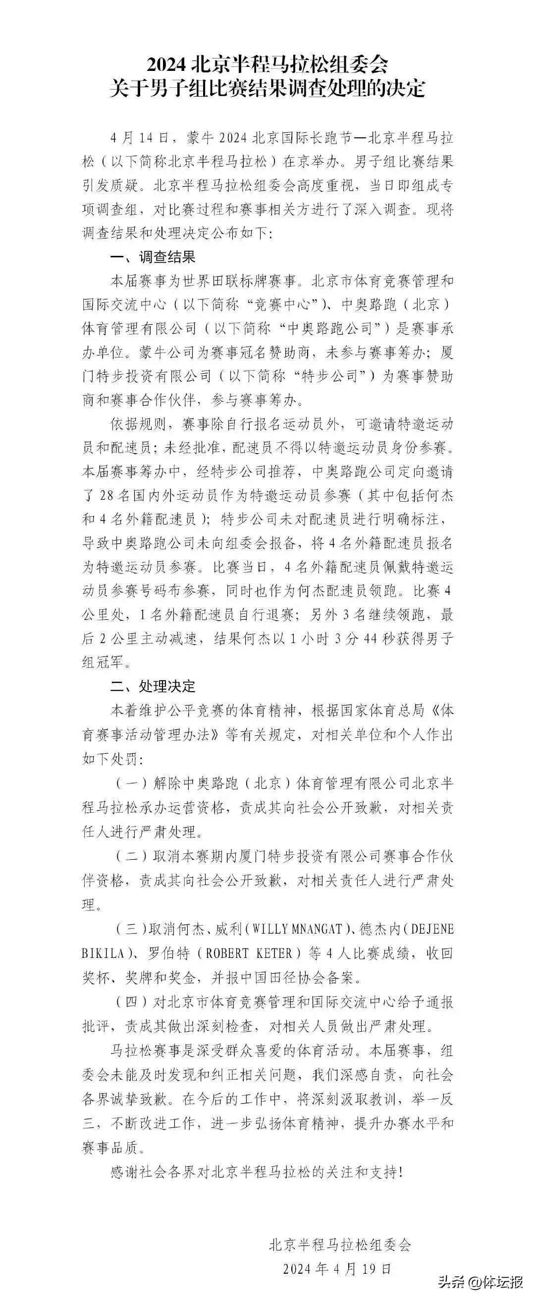 近日,北京半程馬拉松組委會公佈了對男子組冠軍何傑的處罰——取消冠軍資格,收回獎盃、獎金。