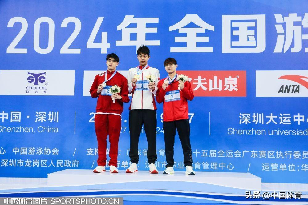 男子800米自由泳決賽中,張展碩以7分47秒84摘金,費立緯以0.02秒之差獲得銀牌,趙祉皓獲得銅牌。(中國體育圖片 黃志 攝)