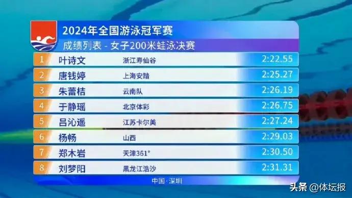 4月24日,全國游泳冠軍賽女子200米蛙泳決賽,葉詩文第五道出場,向着巴黎出發。“葉詩文加油!”觀衆席上那些熱情洋溢的加油聲,如同一股溫暖的力量,激勵葉詩文繼續前行。