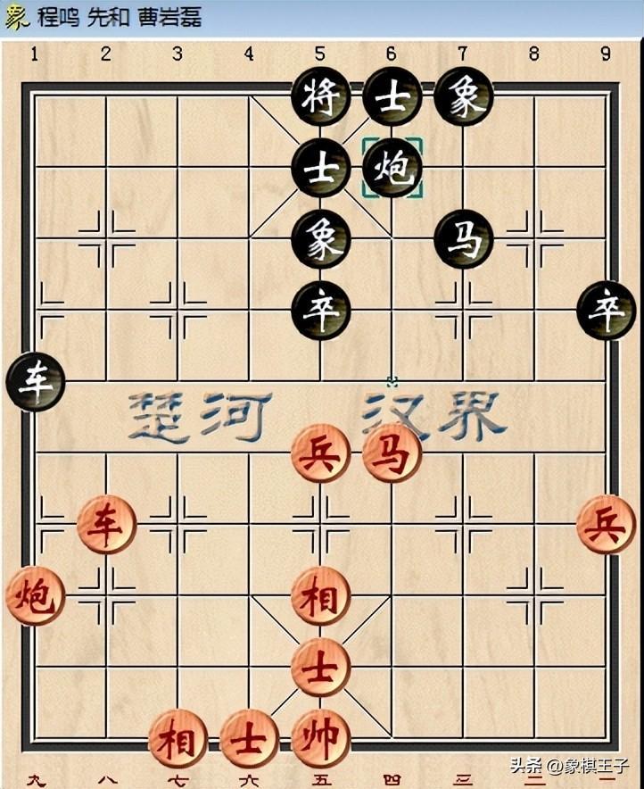 此中程鳴與曹巖磊兩強相爭,仙人指路對挺卒間,內力對峙,56手入車馬炮對車馬炮成平。