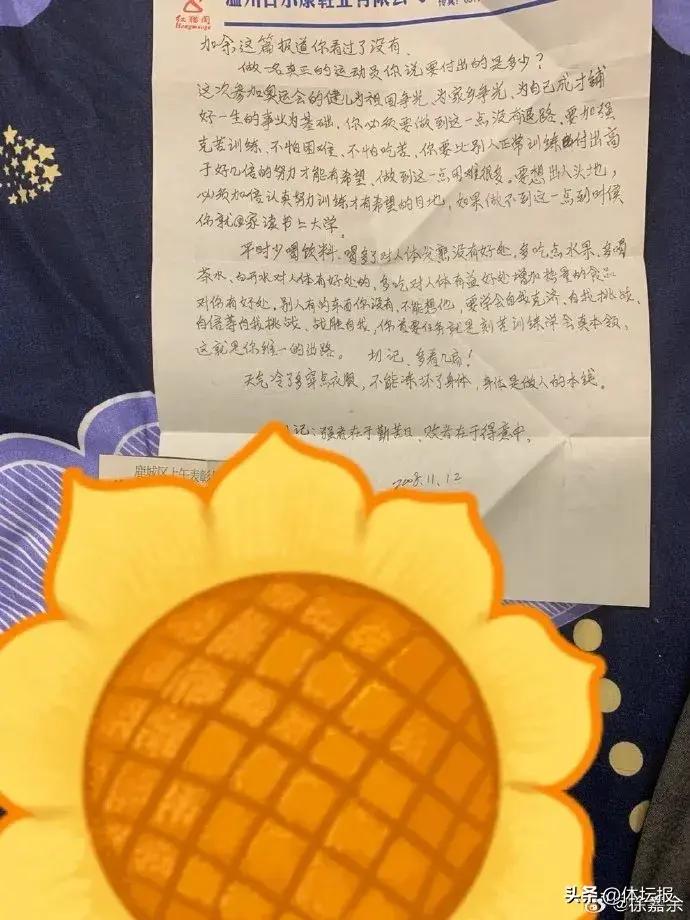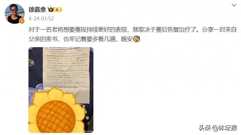 信中,父親勉勵徐嘉餘要刻苦訓練,不畏艱難,注重健康飲食,勇於自我挑戰,並告誡他:“強者在於勤苦日,敗者在於得意中。”徐嘉餘分享這張照片時已是深夜,彼時他還在賽後恢復中。“對於一名老將想要賽段持續更好的表現,就取決於賽後恢復治療了。”