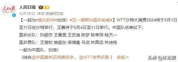 假期首日,乒羽賽場將掀起競技風暴,WTT沙特大滿貫的爭奪將於5月1日打響,王楚欽、孫穎莎、樊振東、王曼昱等一衆國乒全主力出戰,爲即將到來的巴黎奧運會厲兵秣馬。