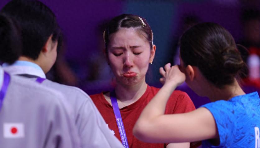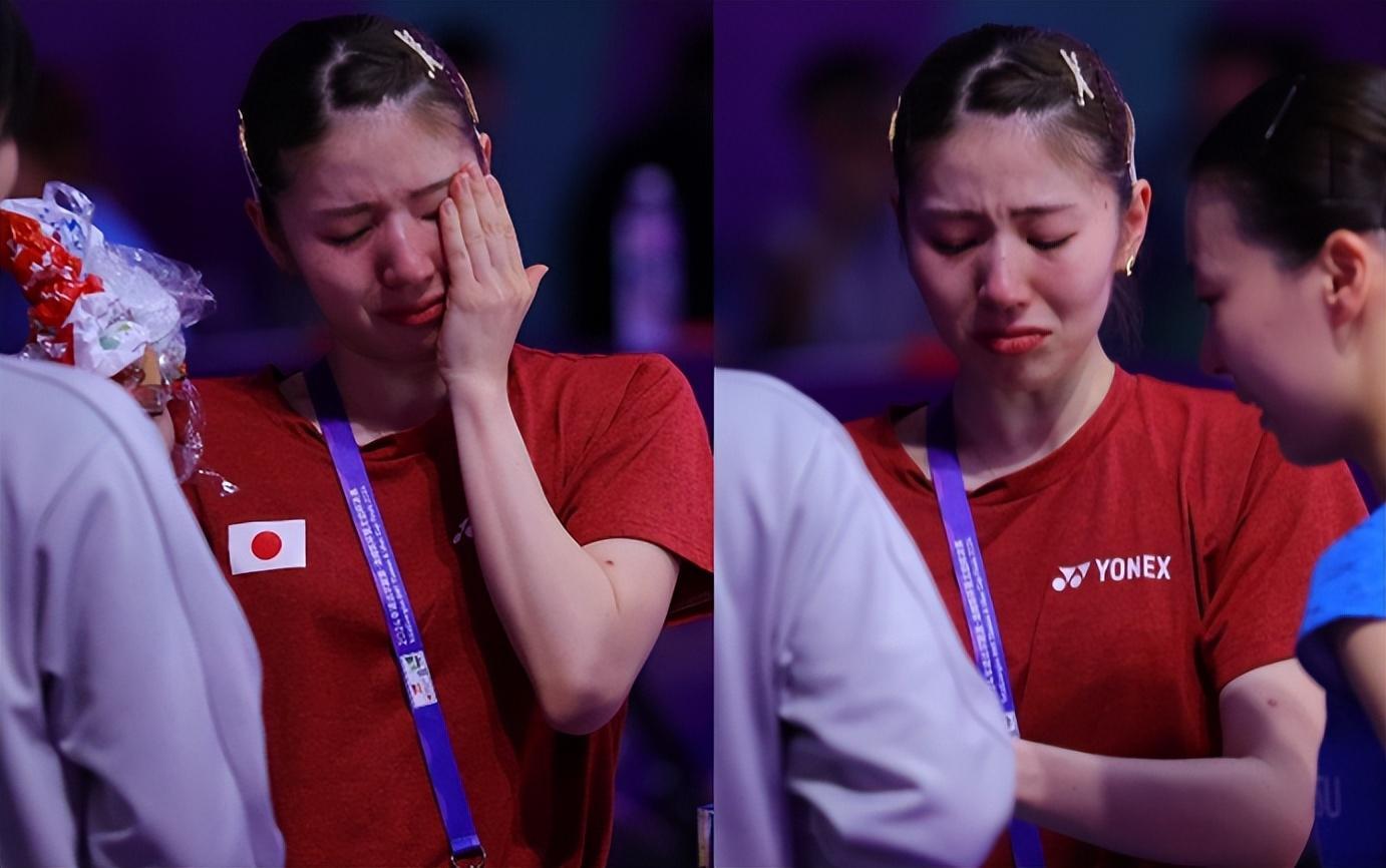 賽後,這位日本女雙運動員一度情緒失控,淚如雨下,噘着嘴,咬脣控制悲傷,隊友們也在試圖用微笑和玩笑來安慰她,中國球迷們感嘆,“真是易碎美女啊!”、“真不忍心讓志田千陽哭。”