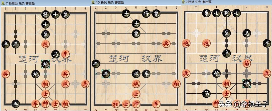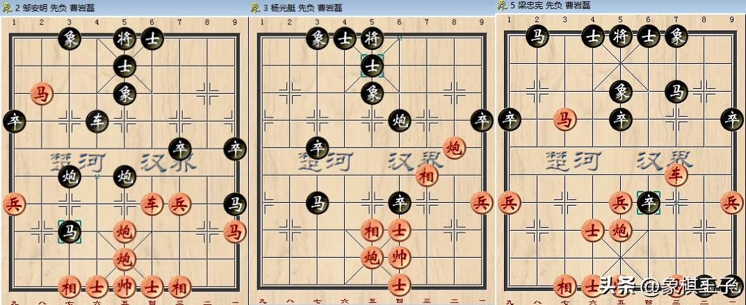 其後曹巖磊又分以飛馬棄車悶殺,馬炮3卒對雙炮兵攻襲,車炮卒破局,連下了雲南驍將鄒安明、舟山勇手楊光艇、陽江戰將梁忠憲三城。