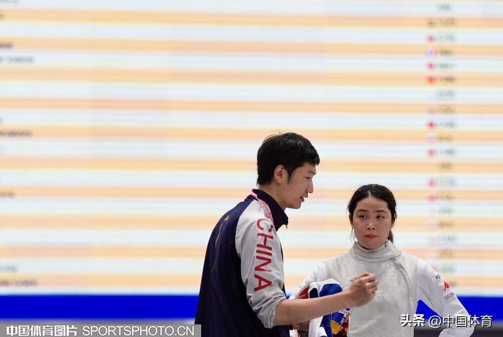 中國花劍隊教練雷聲(左)爲隊員陳情緣指導