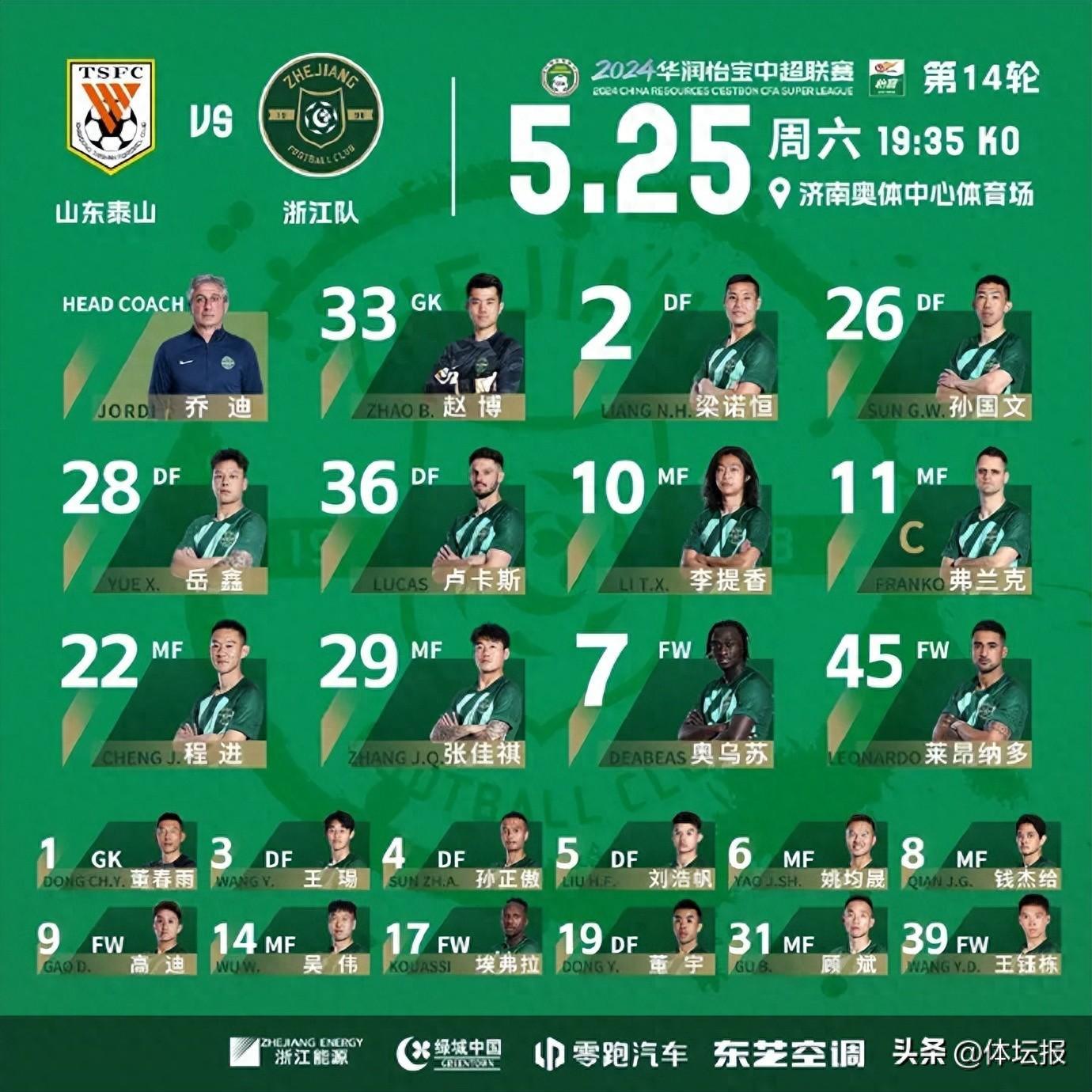 目前,在積分榜上浙江隊與山東泰山僅差三分,故此本場比賽也是一場卡位戰。而從陣容看,本場比賽浙江並未像前兩輪一樣用出五外援首發陣容,而是將埃弗拉、錢傑給等球員放在替補席,可以看得出來面對山東泰山這支強隊,主教練喬迪在有意地爲後援陣容留出一些深度。