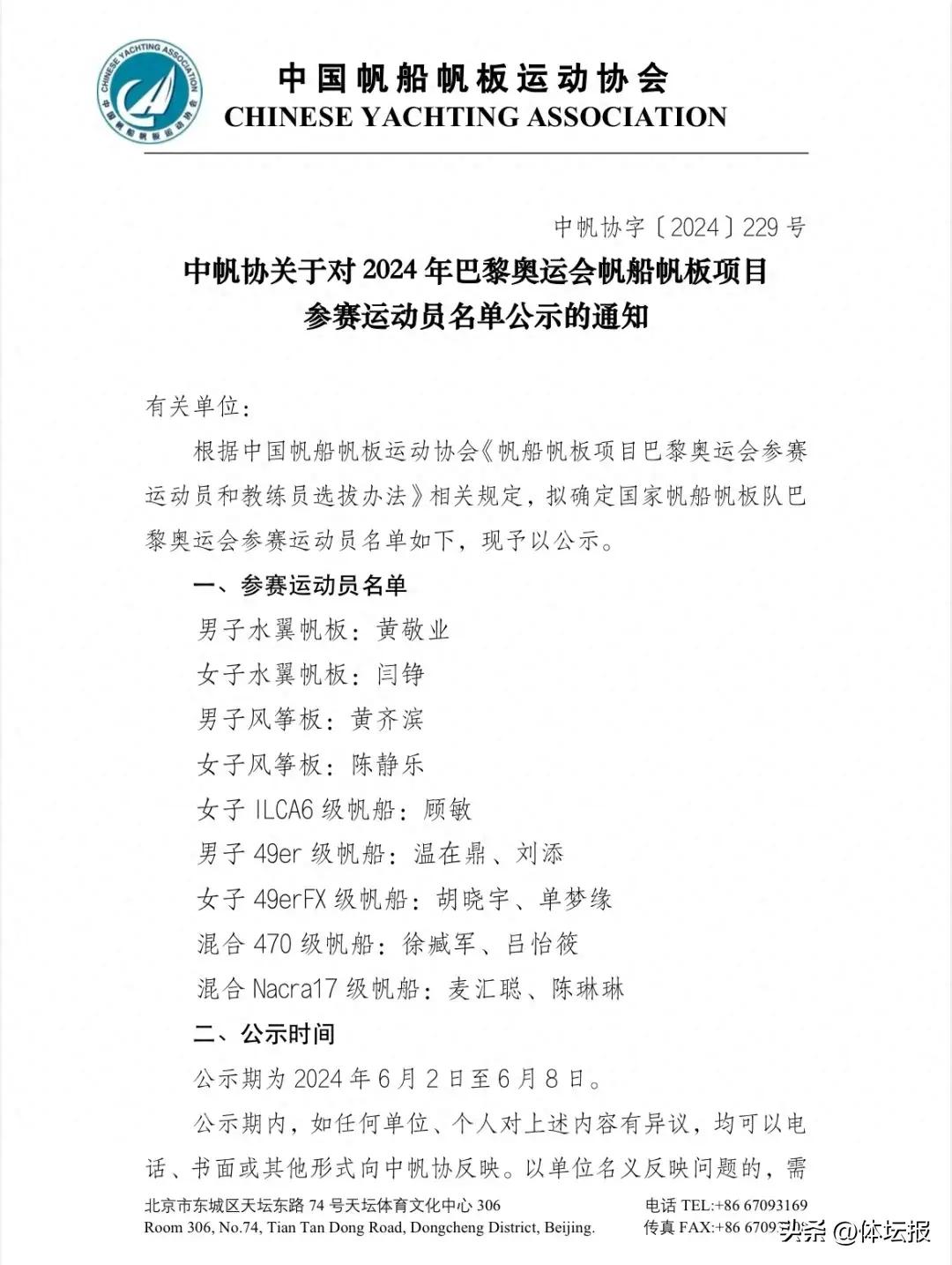 6月2日,中國帆船帆板運動協會正式就代表中國參加巴黎奧運會帆船帆板項目的運動員名單進行公示。中國隊共有13名運動員參與9個項目的比賽,其中,有四位浙江健兒榜上有名,分別是帆船運動員溫在鼎、徐臧軍和帆板運動員閆錚、黃敬業。