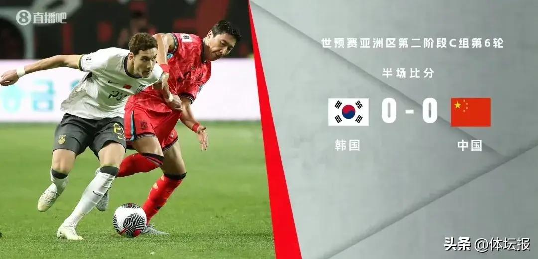 第42分鐘,費南多左側殺入禁區製造威脅,可惜劉洋跟進打門被對方後衛阻擋。補時階段,謝文能在前場反搶犯規也喫到黃牌。隨着鄭又榮禁區前的遠射放了高射炮,兩隊半場戰罷互交白卷。與上一場相比,國足在上半場展現出了更多的防守強度,讓韓國隊在陣地戰中沒能佔得太多便宜。