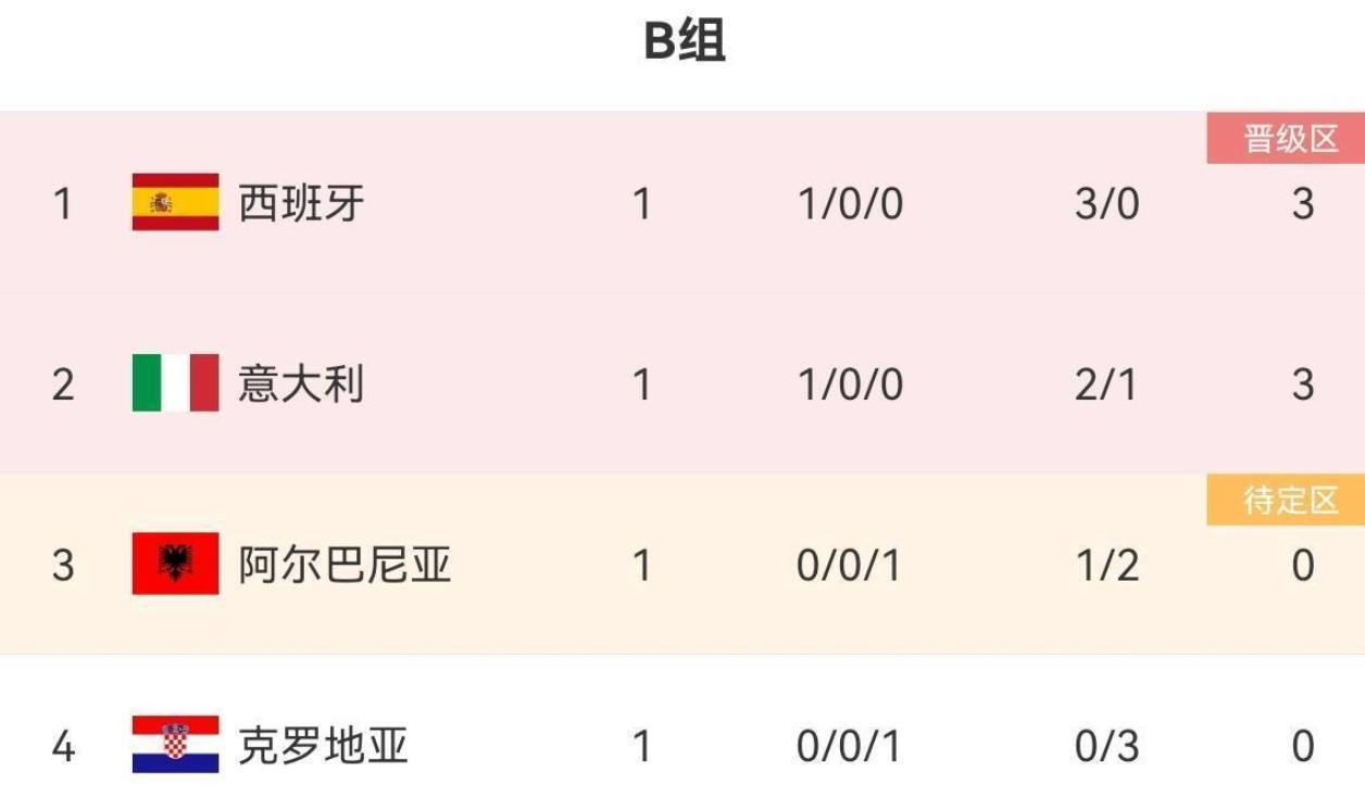 歐洲盃前,B組名單出爐之外,外界紛紛認爲這是最強死亡之組,如今首輪亮相後,小組出線格局又有了新的變化,西班牙意大利手握3分,優勢明顯,但意大利只有1個淨勝球,後續要連續遭遇西班牙和克羅地亞,壓力不小。