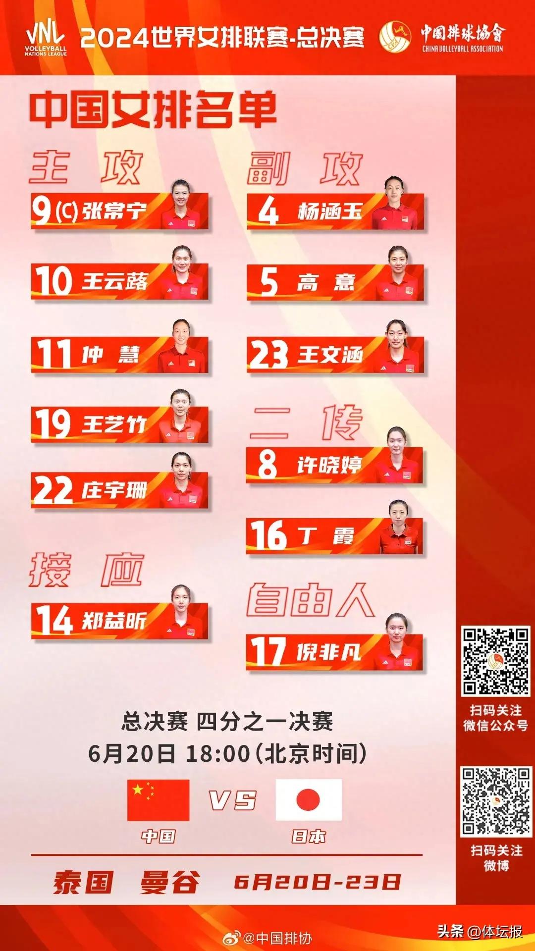 6月18日,中國排球協會公佈了中國女排參加2024年世界女排聯賽總決賽的12人名單。