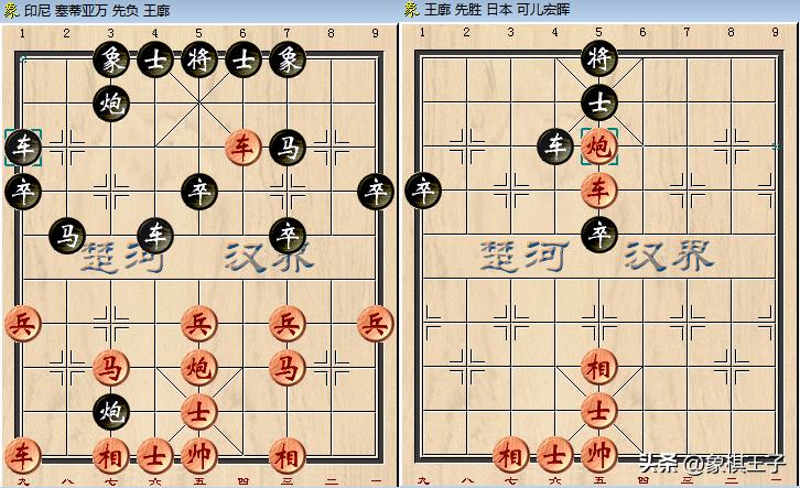 開賽之後,待見中國隊男女二位90后王廓、左文靜率先高歌凱奏,奪取勝利,王廓在與印尼塞蒂亞萬的比賽中,對手非華越裔,先手中炮局,王廓應以反宮馬。