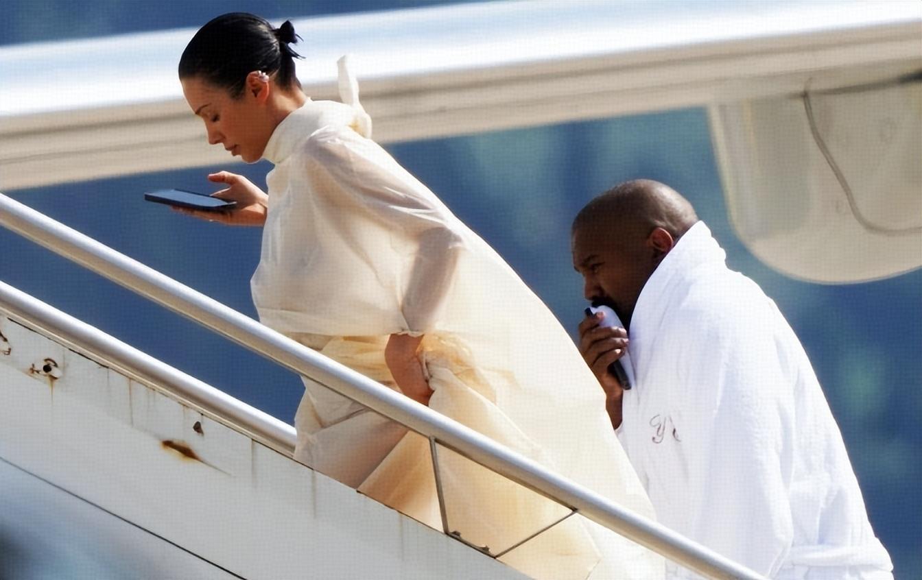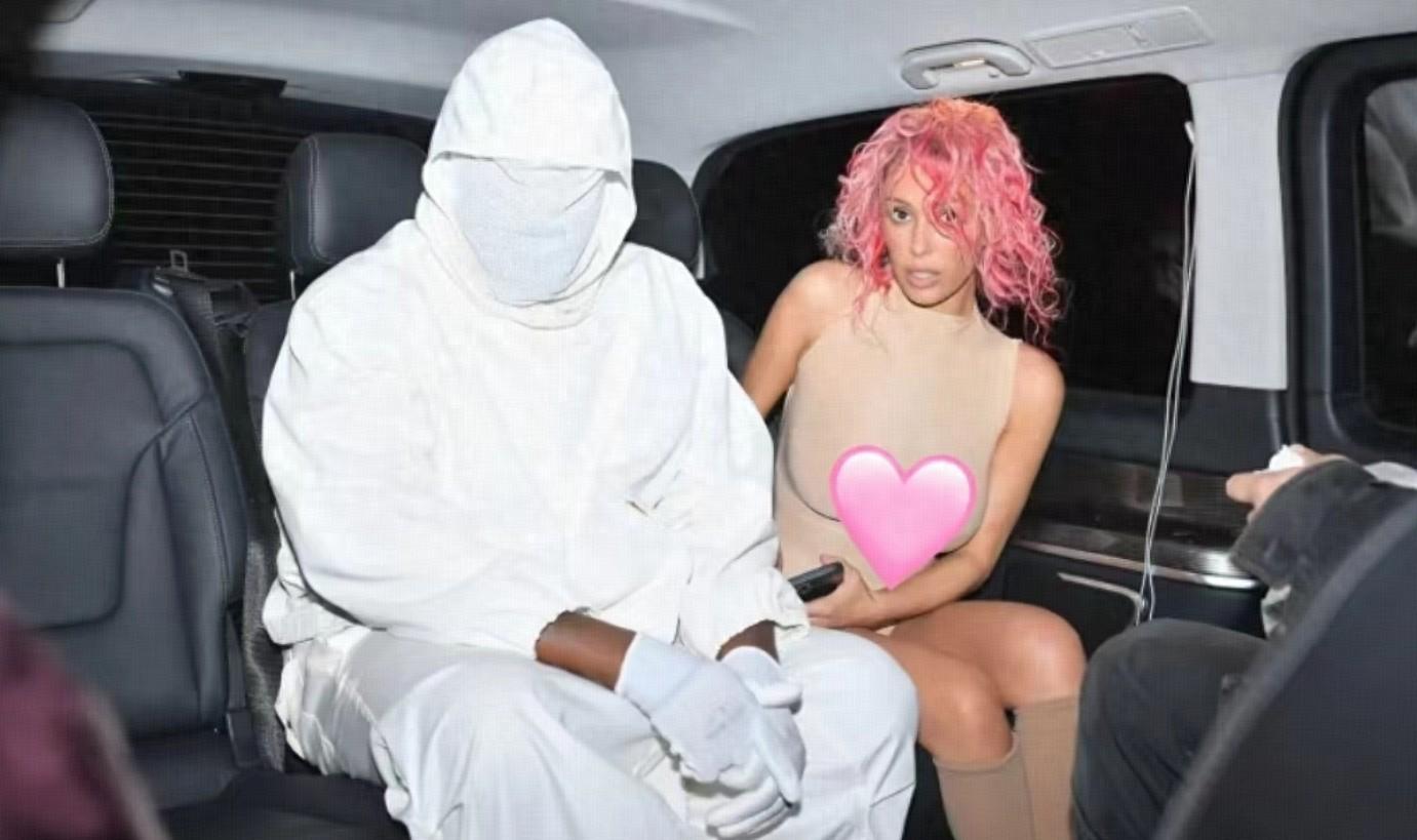染了一頭粉紅髮色的比安卡,看上去年輕了很多,整個人也更加有少女感,當然身邊的侃爺,一如既往裹得嚴嚴實實,白色的面罩把頭全部包住,神祕感拉滿。
