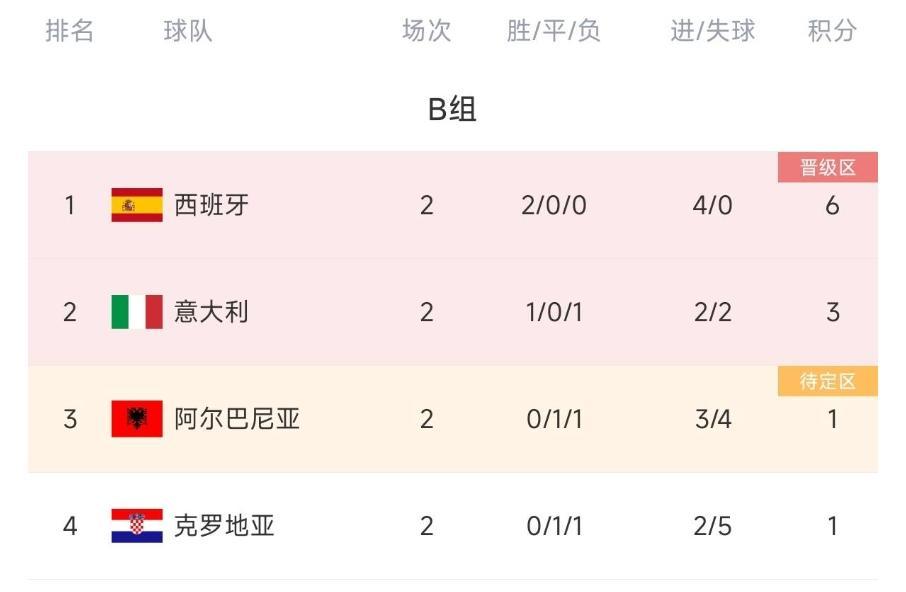 而且一旦阿爾巴尼亞爆冷贏西班牙,拿到4分,意味着“藍衣軍團”輸克羅地亞直接排名墊底了。