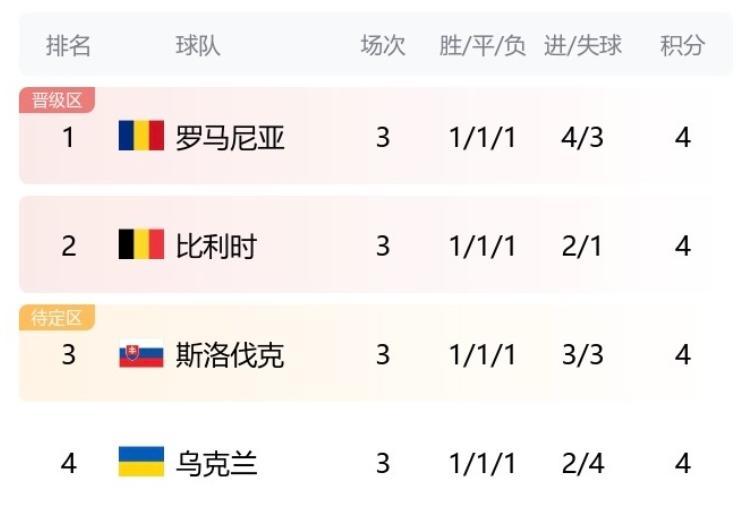 彼時,本組的排名再度變化,4隊繼續同分,羅馬尼亞升至第一,比利時小組第二,斯洛伐克第三,烏克蘭則又墊底了。