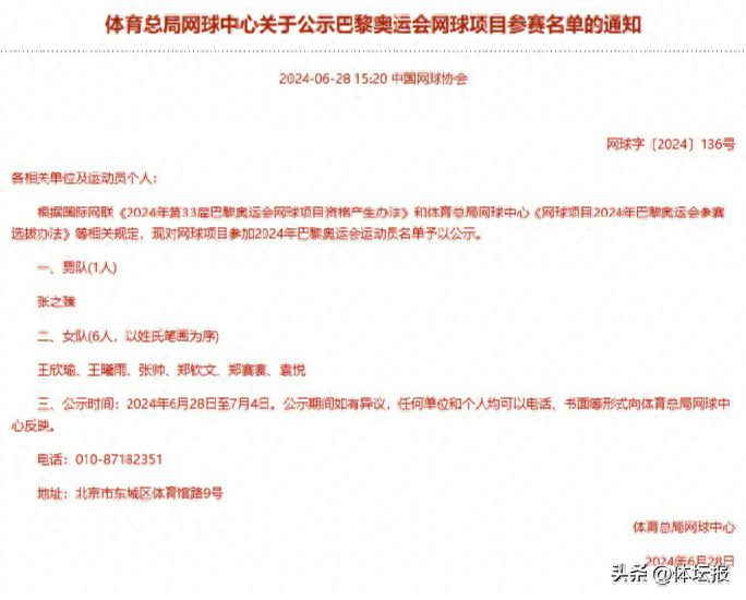 6月28日,國家體育總局網球中心公佈了國家網球隊參加巴黎奧運會網球比賽的運動員名單。