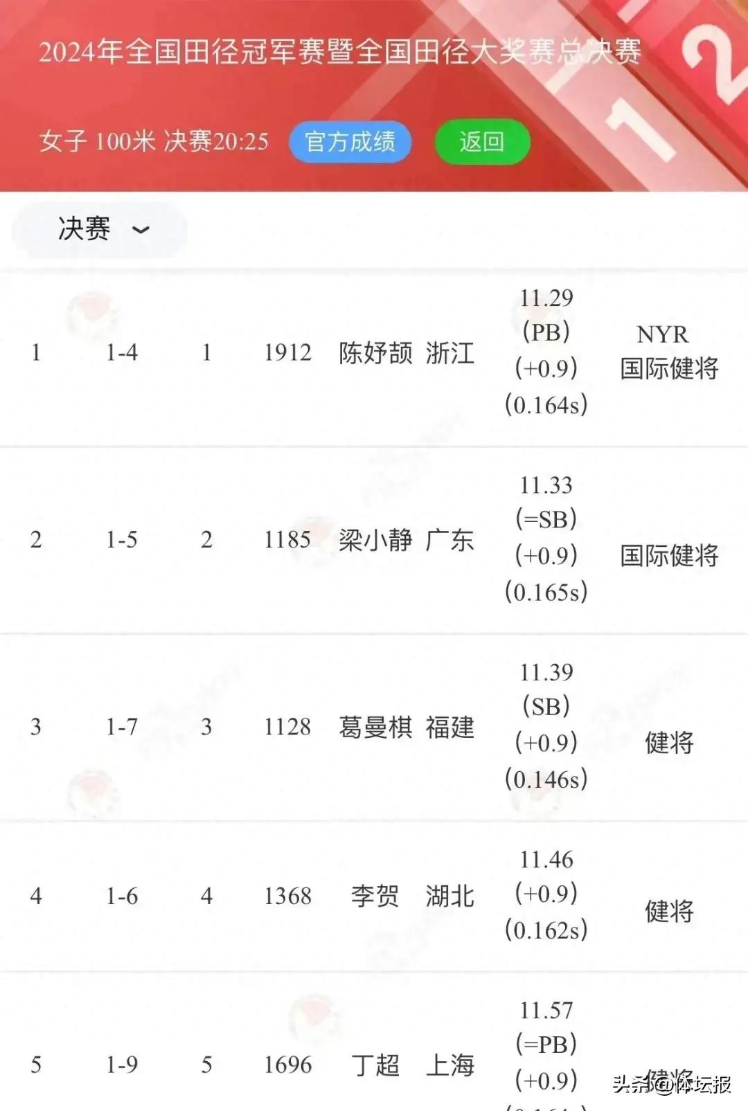 6月29日晚,在2024年全國田徑冠軍賽暨全國田徑大獎賽總決賽女子百米飛人大戰中,浙江15歲“小飛人”陳妤頡再度上演絕佳表現,決賽中力壓葛曼棋、梁小靜等名將,以11秒29奪冠。該成績打破她自己保持的全國少年紀錄的同時,也刷新該項目亞洲少年紀錄,同時成爲今年亞洲首位打開11秒30大關的選手。