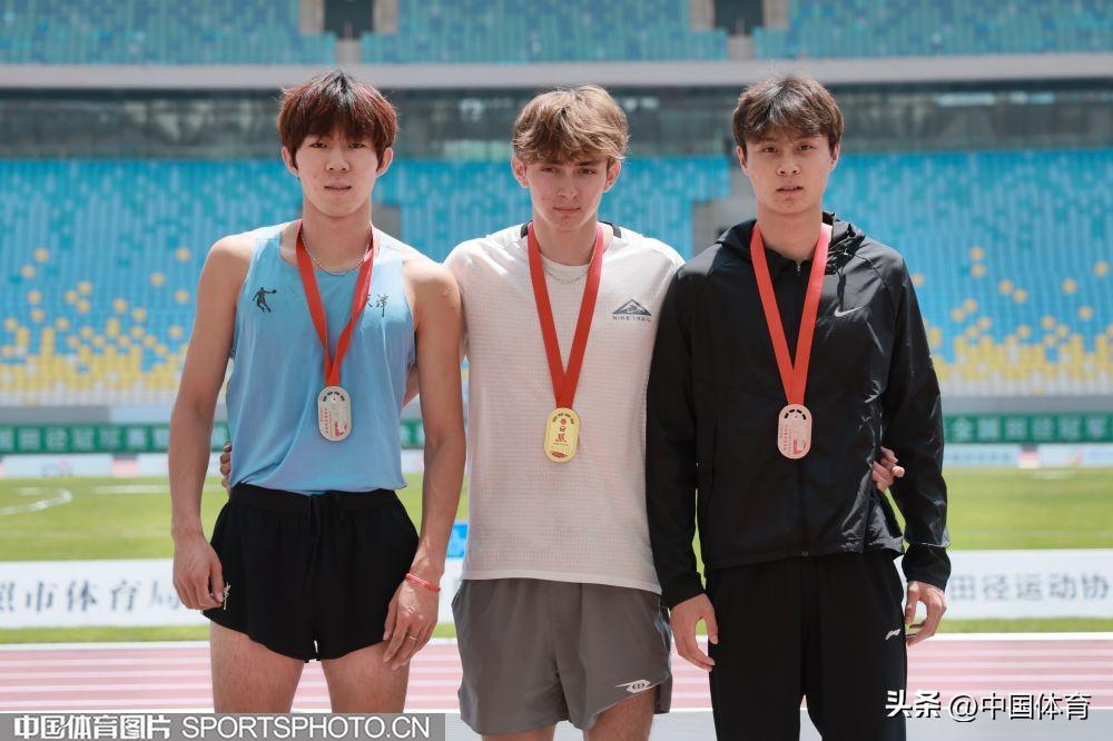 左起)鞠天淇、艾力西爾·吾買爾、劉凱在男子400米頒獎儀式上